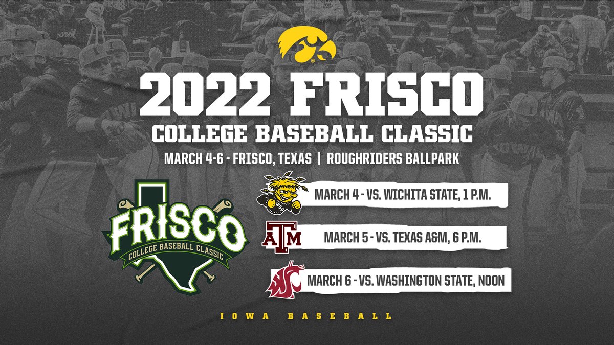 Story Links FRISCO Texas The Texas AM Aggies face the Washington State Cougars Iowa Hawkeyes and Wichita State Shockers in the 2022 Frisco Classic at Riders Field the tournament announced WednesdayThe Aggies are one of four teams featured at the three-day six-game tournament from March 4-6 hosted at the home of the Double-A affiliate of the Texas Rangers. The Hawkeyes will be joined by Texas AM Wichita State and Washington State in Frisco Texas. Iowa will play the Shockers on March 4 Aggies on March 5 and Cougars on March 6 at the.